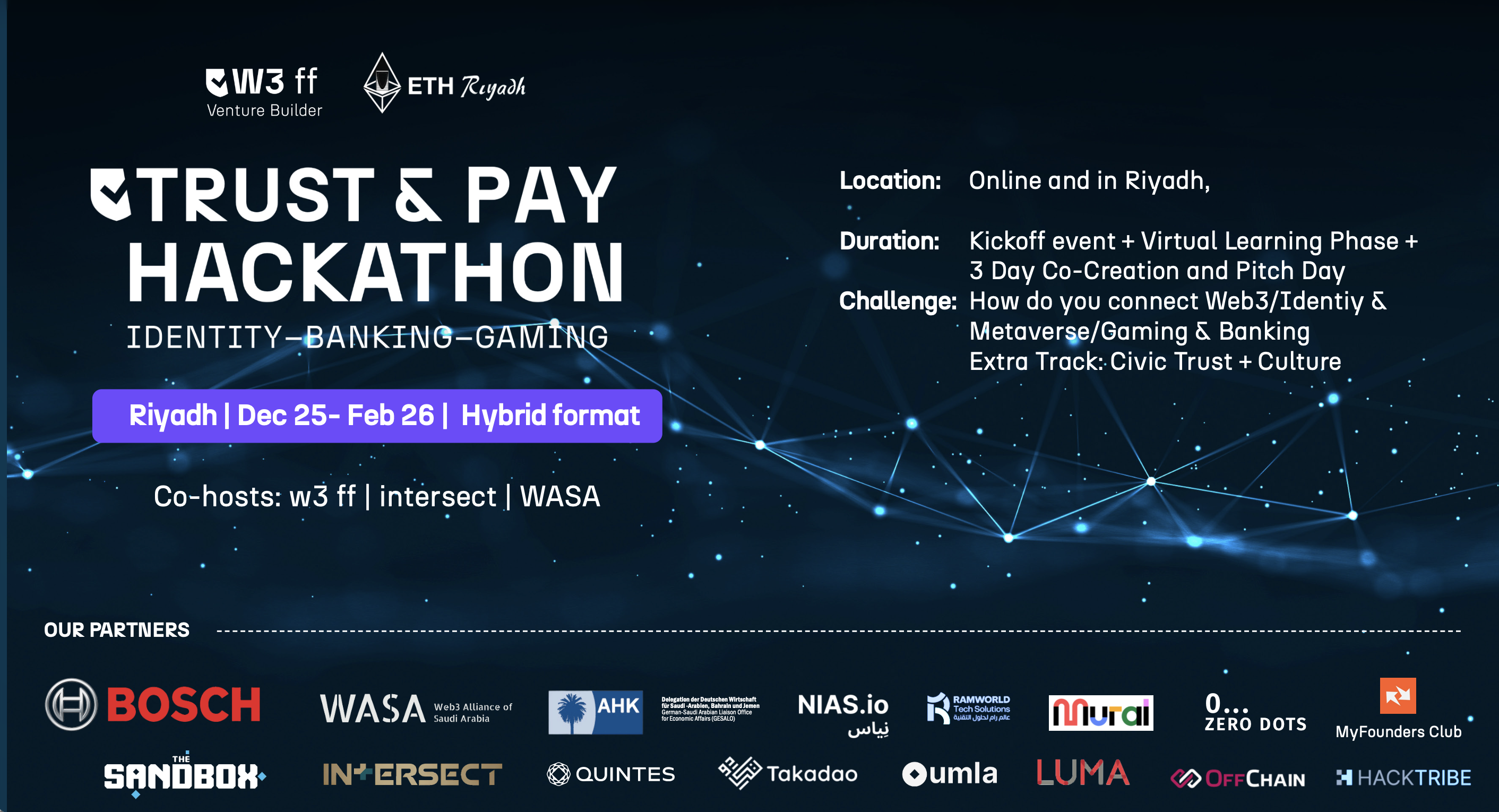 Hosted by w3 ff and WASA in partnership with ETHRiyadh, the Trust & Play Hackathon is a hybrid event where global talents come together to reimagine digital trust. Through storytelling, creativity, and concept-building, we’ll shape new ways of interacting with finance, culture, and technology.